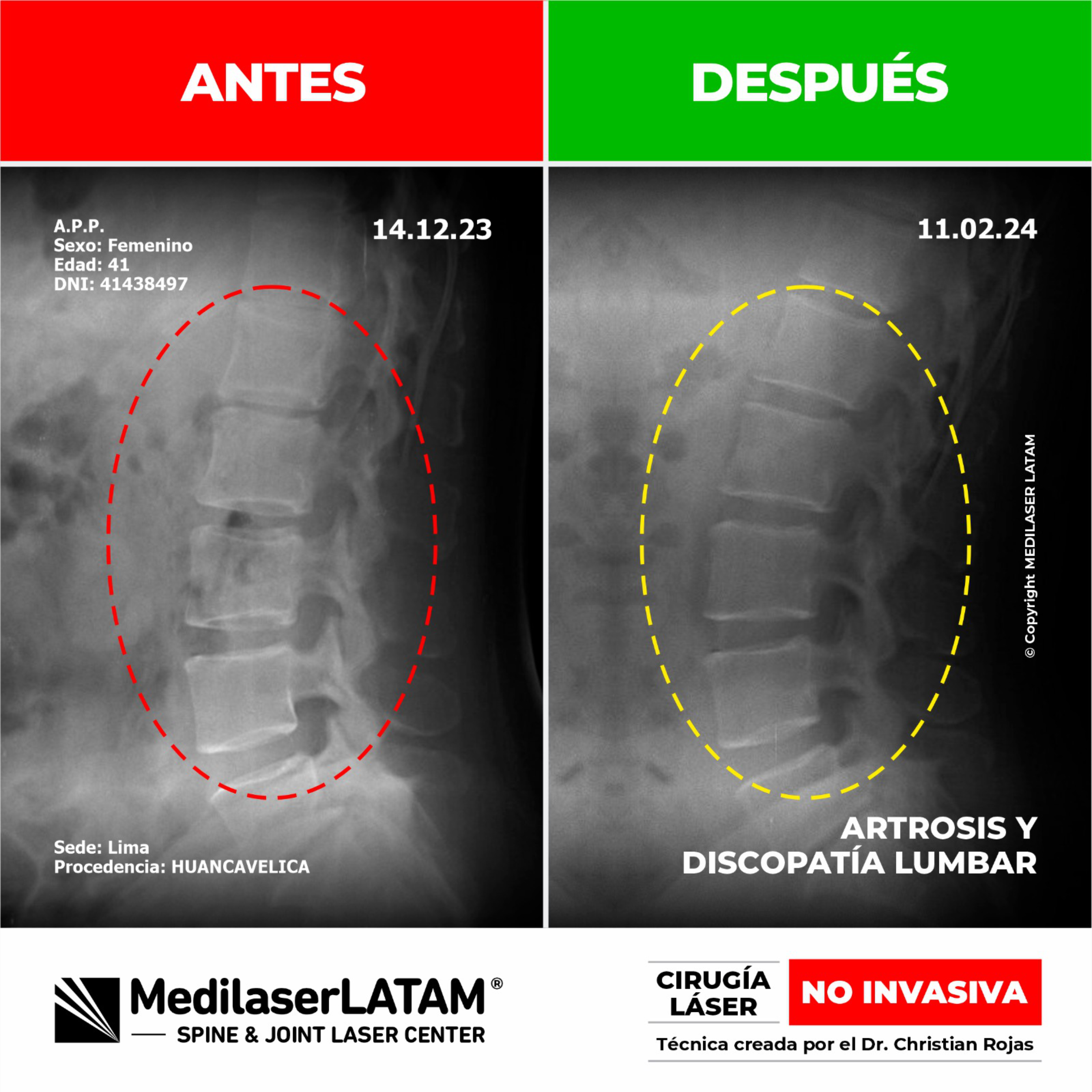 El Dr. Juan Carlos de la Cruz – Médico Radiólogo de MEDILASER LATAM PERÚ, nos hace llegar las siguientes imágenes para compartir evidencia científica con nuestros Pacientes y Profesionales de la Salud. Presentamos un estudio comparativo de un paciente antes y después de someterse al moderno Tratamiento con Láser bajo la Técnica desarrollada por el Dr. Christian Rojas para Hernias y Artrosis.